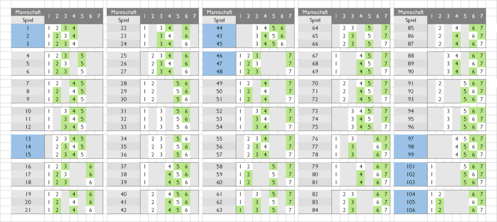 Vereinfachen lässt sich diese Situation dadurch, dass z. B. nur die sieben blau gekennzeichneten Runden frei gewählt und in 7 Wochen ausgetragen werden (je drei Spiele/Woche). Dadurch spielt jede „3er Mannschaft“ vier Wochen und wird nach den erreichten Siegen und Punkten bewertet. Die Nummern der „3er Mannschaften“ (1-7) werden ausgelost. Das wäre darüber hinaus eine Art Pokal-Lösung, wenn die besten vier Mannschaften dann das Finale bestreiten.