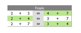 Nach dieser relativ aufwendigen „Vorrunde“ kann dann eventuell an einem Tag das Finale zwischen den 4 besten Mannschaften, hier z. B. 2, 3, 4 und 7 zusätzlich ausgetragen werden. Hier würde die Mini-Mannschaft 4 als Sieger hervorgehen.