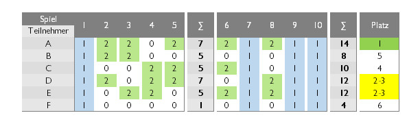 zwei Spieler als Sieger im Zwischenergebnis (ZW∑) hervorgegangen (A und D). Die