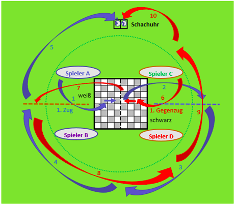 Spieler A, B und C ziehen die Züge abwechselnd für weiß. Spieler D, E und F gestalten