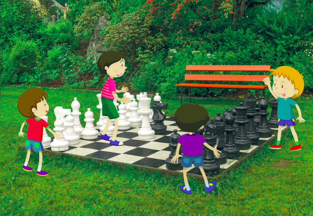 - An der Seite des Schachfeldes im Freien wird außerhalb des großen Kreises der Tisch mit Schachuhr aufgestellt. Für jeden der 4 Spieler werden Standortkreise an der Ecke des Schachbrettes, wo sie mit dem Zug starten und nach dem Zug zurückkehren, gezogen.