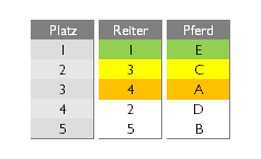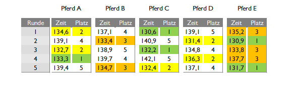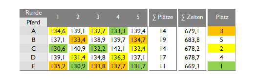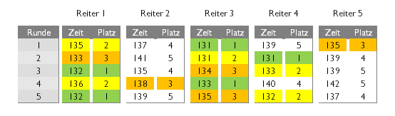 Z. B. Reiter 1 mit 689,9 Sec. ist besser als Reiter V mit 692,4 Sec.