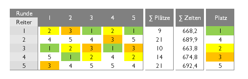 In der Wertung zählt vorerst die Platzierung, danach die bessere Zeit. Z. B. zuerst zählt die beste Platzierung (Reiter 1, 3, 4), bei Gleichheit der Summe der Plätze (Reiter 2 und 5) wird die Zeitsumme herangezogen, z. B. Reiter-Nr. 2 mit 689,9 s ist besser als Reiter-Nr. 5 mit 692,4 s.
