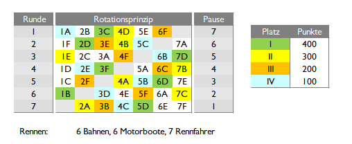 Sieben Rennen würden die Entscheidung, wer der bessere Rennfahrer ist und wem das bessere Rennboot gehört hervorbringen. Z. B. die Bestplatzierten erhalten in einem Rennen, wie üblich 400, 300, 200 und 100 Punkte. Da könnte der Sieger an diesem Kampftag theoretisch 2.400 Punkte erhalten.