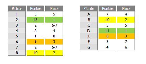 Wenn 1. Platz der Runde grün, 2. Platz – gelb und 3. Platz orange gekennzeichnet sind und der 1. Platz – 3 Punkte erhält (2. Platz – 2 Punkte, 3. Platz – 1 Punkt), dann sieht das Ergebnis des Pferde-Rennens wie folgt aus: