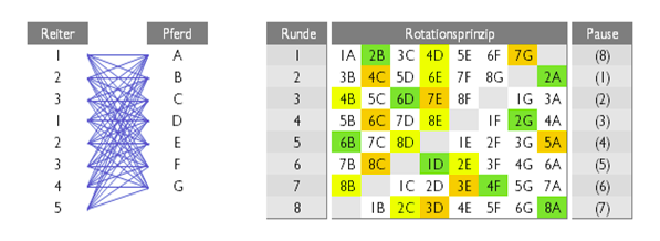 Wenn für acht angemeldeten Reiter nur sieben Pferde zur Verfügung stehen, dann müssten acht Rennen ausgetragen werden, in denen jeweils ein Teilnehmer pausiert. Aber jeder Teilnehmer hat jedes Pferd einmal geritten. Und so sieht die Rundenzusammensetzung dann aus:
