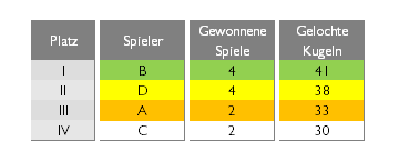 - den 1. Anstoß macht der Spieler A, die Antwort obliegt nach dem Anstoßverlust (nicht eingelocht) dem Spieler C. Falls einer getroffen hat, ist die Farbe (volle Kugel oder halbe Kugel) festgelegt.