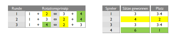Die Ergebnisse könnten dabei z. B. so aussehen (Spiel 1 – 1+2 gegen 3+4; Spiel 2 – 1+3 gegen 2+4 usw.):