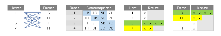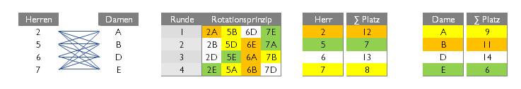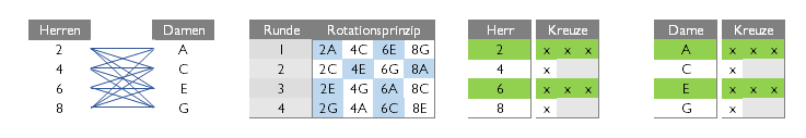 Es ist nicht ausreichend, wenn, wie im üblichen Turnier, nur die Herren eine feste Rückennummer erhalten, da die Mannschafts-Konstellation sich aus der mathematischen Struktur der Runden ergibt und die jeweilige Damenwertung dem entsprechenden Herren in der Runde zugeordnet werden kann. Dieser Nachweis ist vor allem für die Verfolgung des Geschehens durch die interessierte und aufmerksame Zuschauer erforderlich.