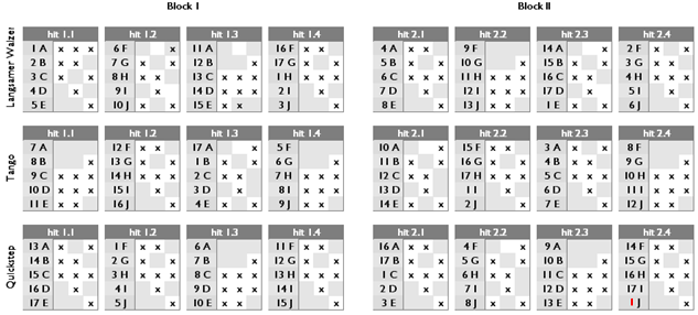 In jedem Block müssen so viele Runden/hits getanzt werden, damit alle Herren drankommen, zwei Blöcke sind in der Regel ausreichend. Die Nummern für die Herren und die Buchstaben für die Damen werden bei der Anmeldung vor Ort ausgelost. In jeder Runde tanzen wie gewohnt fünf Tanzpaare, die drei besten Paare werden von jedem der drei Wertungsrichtern mit einem Kreuz für die nächste Runde honoriert.