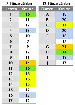 Bei einem Ein-Tanz-Turnier (z. B. nur Cha-Cha-Cha) würden folgende Tänzer mit maximalen Summen der Kreuze in die nächste Runde weiterkommen: