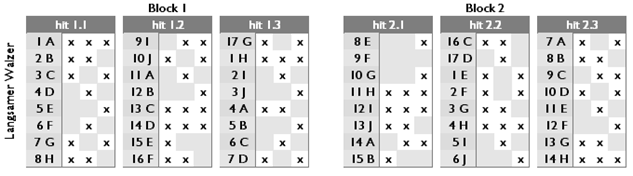 Wenn wir uns die Tabelle der Bewertungen in der Vorrunde ansehen, dann werden auch die regelmäßigen vorgesehenen Ansetzungen der Paare ersichtlich. In der 1. Runde (hit 1.1) tanzen die Herren 1 bis 5 und die Damen A bis E, usw. Die Paare 1A, 2B und 3C haben von den Wertungsrichtern mit zwei bis drei Kreuzen den Vorzug in der nächsten Stufe – im Halbfinale zu tanzen.