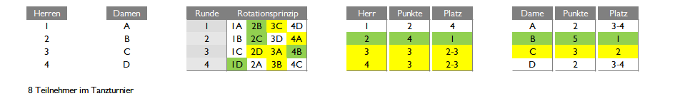 Wenn in einer Runde der 1. Platz – 2 Punkte erhält (grün) und der 2. Platz – 1 Punkt (gelb), dann können aus den 4 Runden mit unterschiedlicher Zusammensetzung der Paare der beste Partner und die beste Dame ermittelt werden.