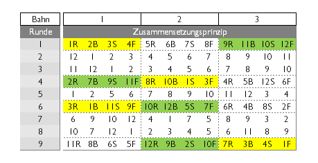 Nachfolgend ein Beispiel für Frauen-Staffel 4×100 Meter. Dabei werden aus den vielen möglichen Varianten der Runden-Zusammenstellung drei Mannschafts-Zusammensetzungen ausgewählt (hier eingerahmt) und die Schwimmerinnen möglichst auf unterschiedliche Bahnen eingeteilt.