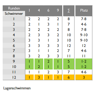 Es kann damit die beste Mannschaft ermittelt werden – die Schwimmer 9, 10 und 12 haben in je drei Schwimmstilen gewonnen. Den vierten Schwimmer würde man zwischen den Schwimmern 2, 7 und 11 nach der besten geschwommenen Zeit ermitteln.